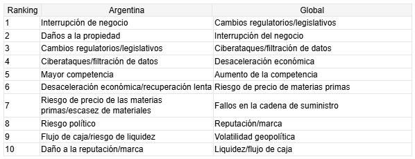 Principales riesgos actuales para Argentina vs Globales:En línea con lo que sucede a nivel local, la interrupción de la actividad empresarial sigue siendo el principal riesgo para las organizaciones regionales debido a la exposición de crisis geopolíticas, eventos climáticos extremos, su dependencia de las rutas comerciales globales y la vulnerabilidad de la infraestructura local.