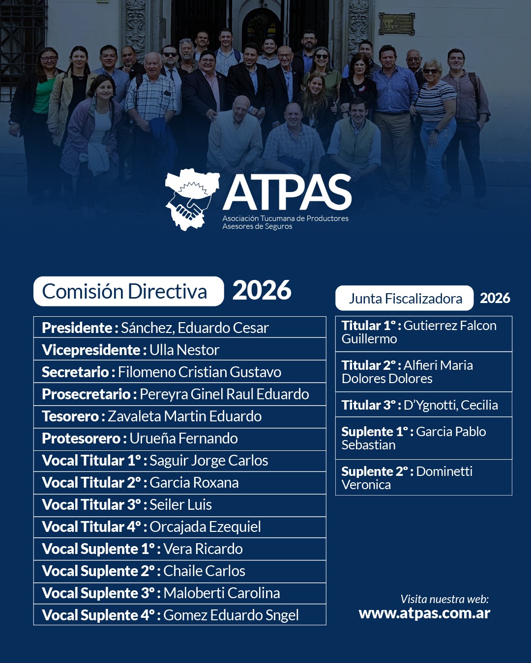Desde ATPAS presentamos a quienes asumen el compromiso de seguir fortaleciendo el sector asegurador en Tucumán. Un equipo de profesionales que trabajará con responsabilidad, gestión y visión de futuro para acompañar a todos los productores asesores de seguros.