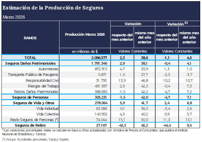A través de la misma hace saber que la estimación de la Producción Total de Seguros para el mes de Marzo 2026 fue de 2,096 Billones de pesos, de los cuales el 85,4 % corresponde a los Seguros Patrimoniales, el 13,3% a los Seguros de Vida y Otros (Vida Individual/Colectivo y resto Seguros de Personas), y el 1,3% a los Seguros de Retiro.