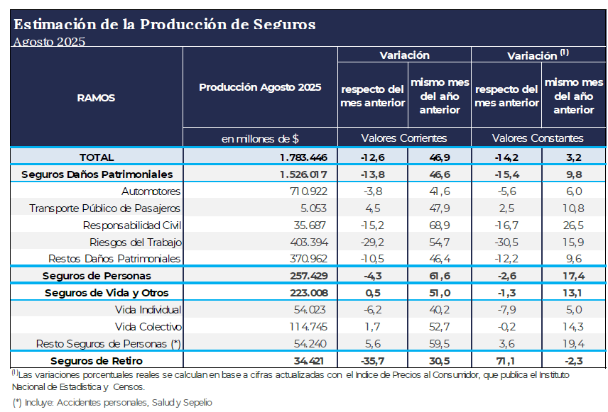 A través de la misma hace saber que la estimación de la Producción Total de Seguros para el mes de Agosto 2025 fue de 1,783 Billones de pesos, de los cuales el 86,2% corresponde a los Seguros Patrimoniales, el 12,6% a los Seguros de Vida y Otros (Vida Individual/Colectivo y resto Seguros de Personas), y el 1,2% a los Seguros de Retiro.