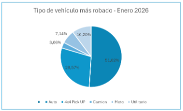 El informe reveló que los autos particulares fueron los vehículos más robados, en un 51,02% de los casos. Sin embargo, en este último mes se registró un aumento en las Pick Ups 4x4, que pasaron del 16,22% en diciembre al 28,57% en enero. Los utilitarios representaron un 10,20%, las motos un 7,14% y los camiones un 3,06%, este último con una leve suba respecto al mes anterior.