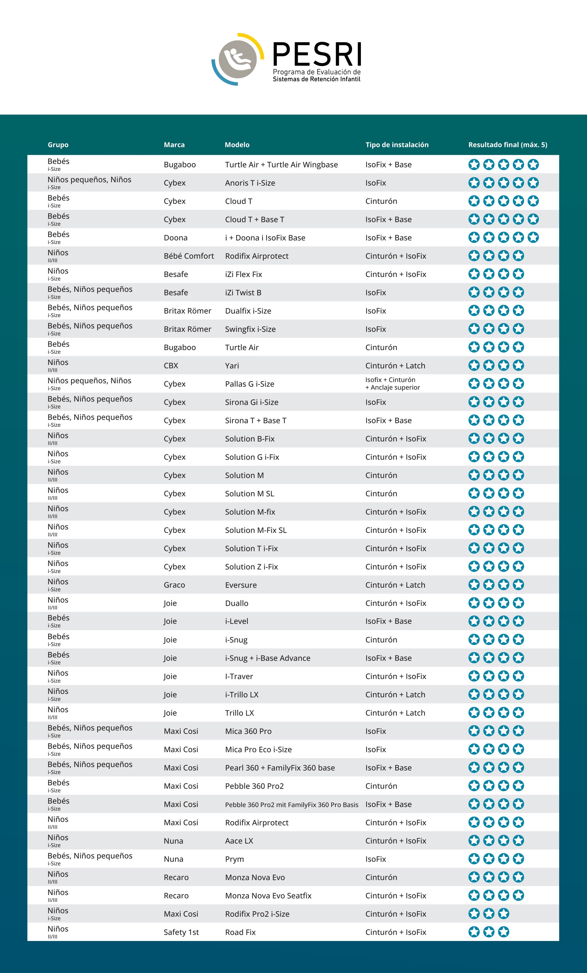 Además, los siguientes modelos recibieron calificación de 4 estrellas: Besafe iZi Flex Fix para niños, Besafe iZi Twist B para bebés y niños pequeños, Britax Römer Dualfix i-Size para bebés y niños pequeños, Britax Römer Swingfix i-Size para bebés y niños pequeños, Bugaboo Turtle Air sin base para bebés, CBX Yari para niños, Cybex Solution M para niños, Cybex Solution M SL/ M-Fix/ M-Fix SL para niños, Cybex Sirona Gi i-Size para bebés y niños pequeños, Cybex Sirona T i-Size + Base T para bebés y niños pequeños, Cybex Solution B-Fix/ G i-Fix/ T i-Fix/ Z i-Fix para niños, Joie Duallo para niños, Joie i-Level para bebés, Joie Trillo LX para niños, Joie i-Snug con y sin i-Base Advance para bebés, Joie i-Traver para niños, Joie i-Trillo LX para niños, Maxi-Cosi Rodifix Airprotect para niños, Maxi-Cosi Mica 360 Pro para bebés y niños pequeños, Maxi-Cosi Mica Pro Eco i-Size para bebés y niños pequeños, Maxi-Cosi Pearl 360 + base FamilyFix 360 para bebés y niños pequeños, Maxi-Cosi Pebble 360 Pro2 con y sin base FamilyFix 360 Pro Basis para niños, Nuna Aace LX para niños, Nuna Prym para bebés y niños pequeños, Recaro Monza Nova Evo/ Evo Seatfix para niños.
