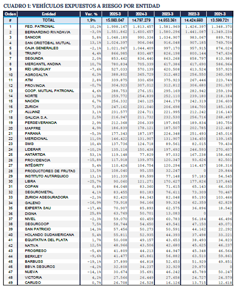 Federación Patronal es la aseguradora con mayor cantidad de vehículos asegurados, seguida por Seguros Rivadavia, Sancor, San Cristóbal y La Caja completan el top five.