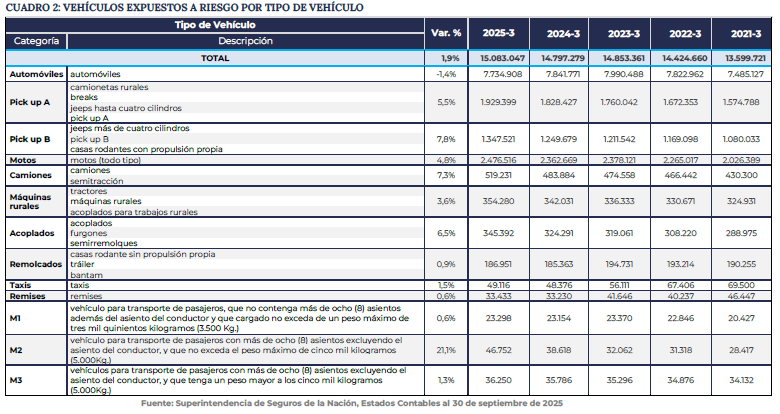 La Superintendencia de Seguros de la Nación a través de la Circular Informativa IF-2025-136472492-APN-GEYE#SSN de fecha 10 de Diciembre de 2025 publicó los Vehículos Expuestos a Riesgo al 30 de Septiembre de 2025.